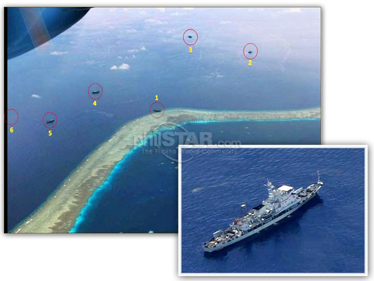 The photo, taken by a Philippine Navy Islander aircraft, also shows five Chinese ships surrounding the frigate.