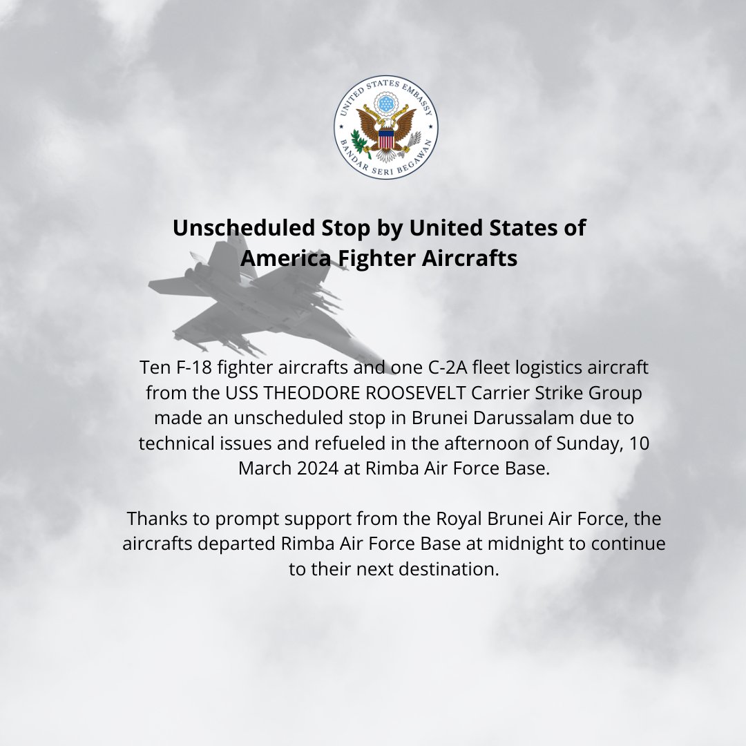 The U.S. Embassy in Brunei confirmed that the visiting aircraft consisted of ten F/A-18 fighter jets and a single C-2A Greyhound fleet logistics support aircraft. These aircraft belong to the USS Theodore Roosevelt Carrier Strike Group, currently operating in the Indo-Pacific region. The Embassy added that the aircraft were parked at Royal Brunei Air Force Base, Rimba, which shares the main runway with Brunei International Airport.