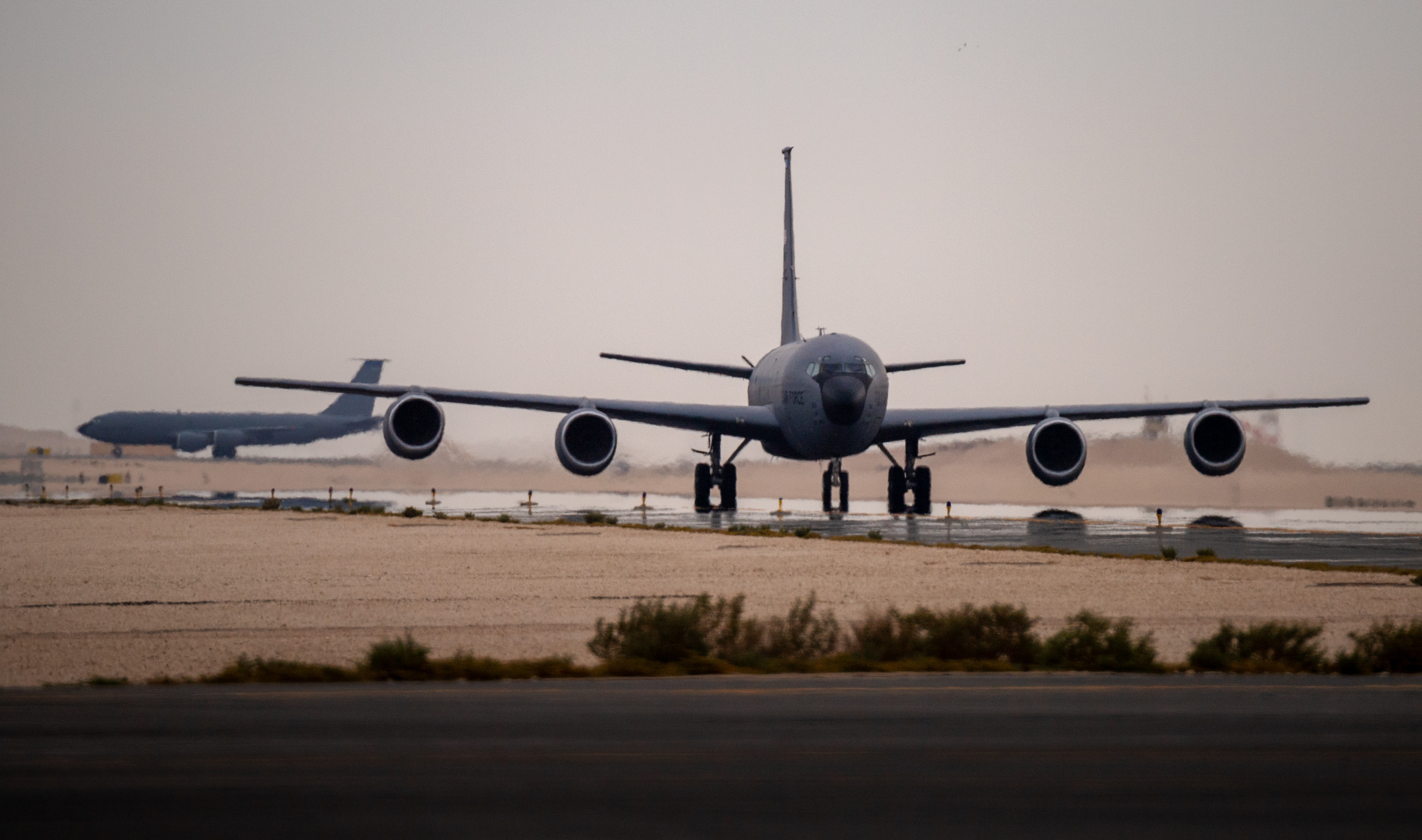 A U.S. Air Force KC-135 Stratotanker assigned to the 350th Expeditionary Air Refueling Squadron taxis at an undisclosed location within the U.S. Central Command area of responsibility, April 15, 2024. The 350th EARS is deployed within the CENTCOM area of responsibility to help defend U.S. and coalition interests, promote regional security, and deter potential adversaries in the region. (U.S. Air Force photo)