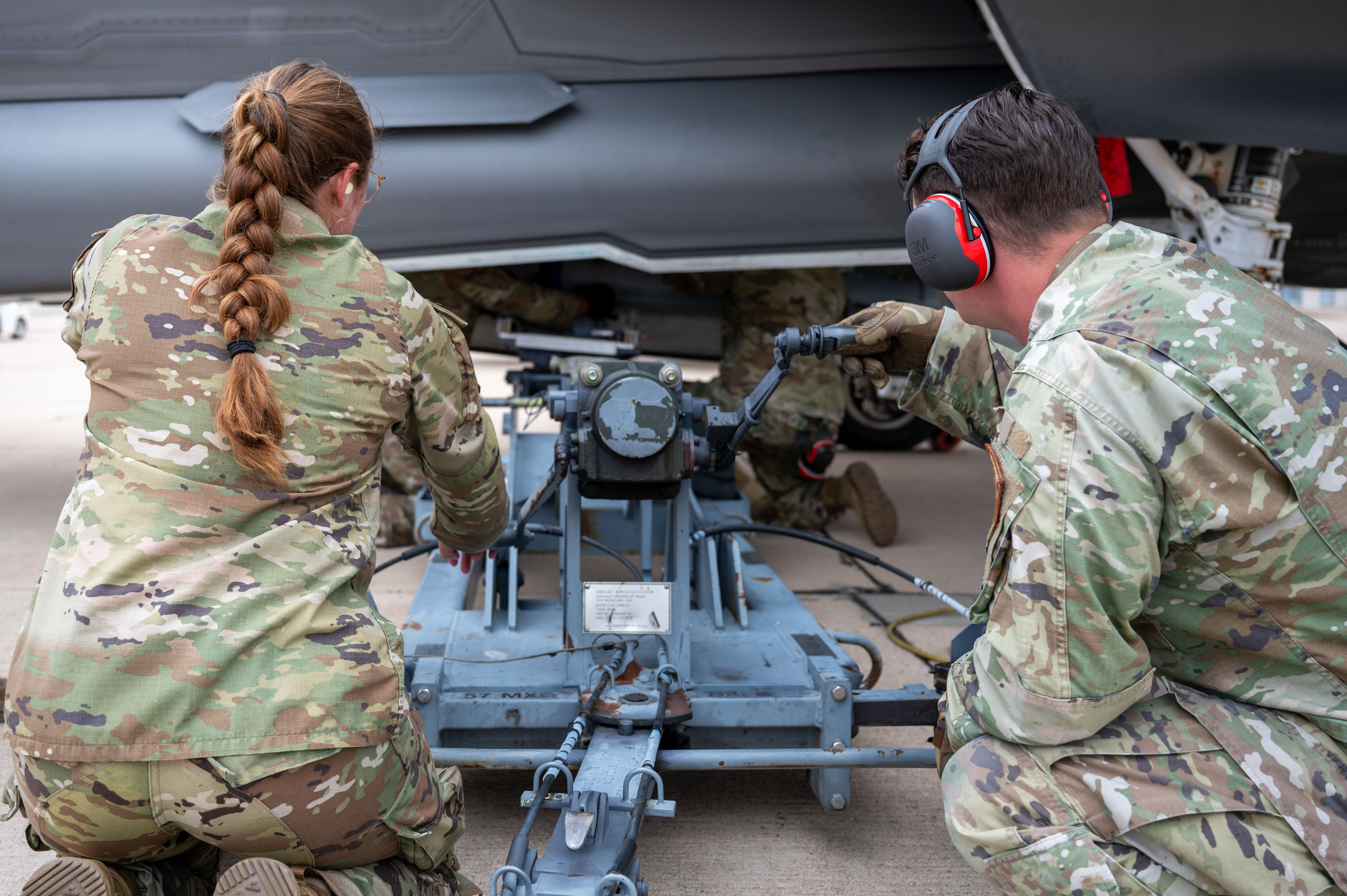 The USAF typically utilizes the MJ-1(also called a “jammer”), a motorized lift truck, for transporting and loading munitions onto aircraft. This equipment offers a 25-horsepower engine powering the drive wheels and a lift arm with a 3,000-pound capacity.