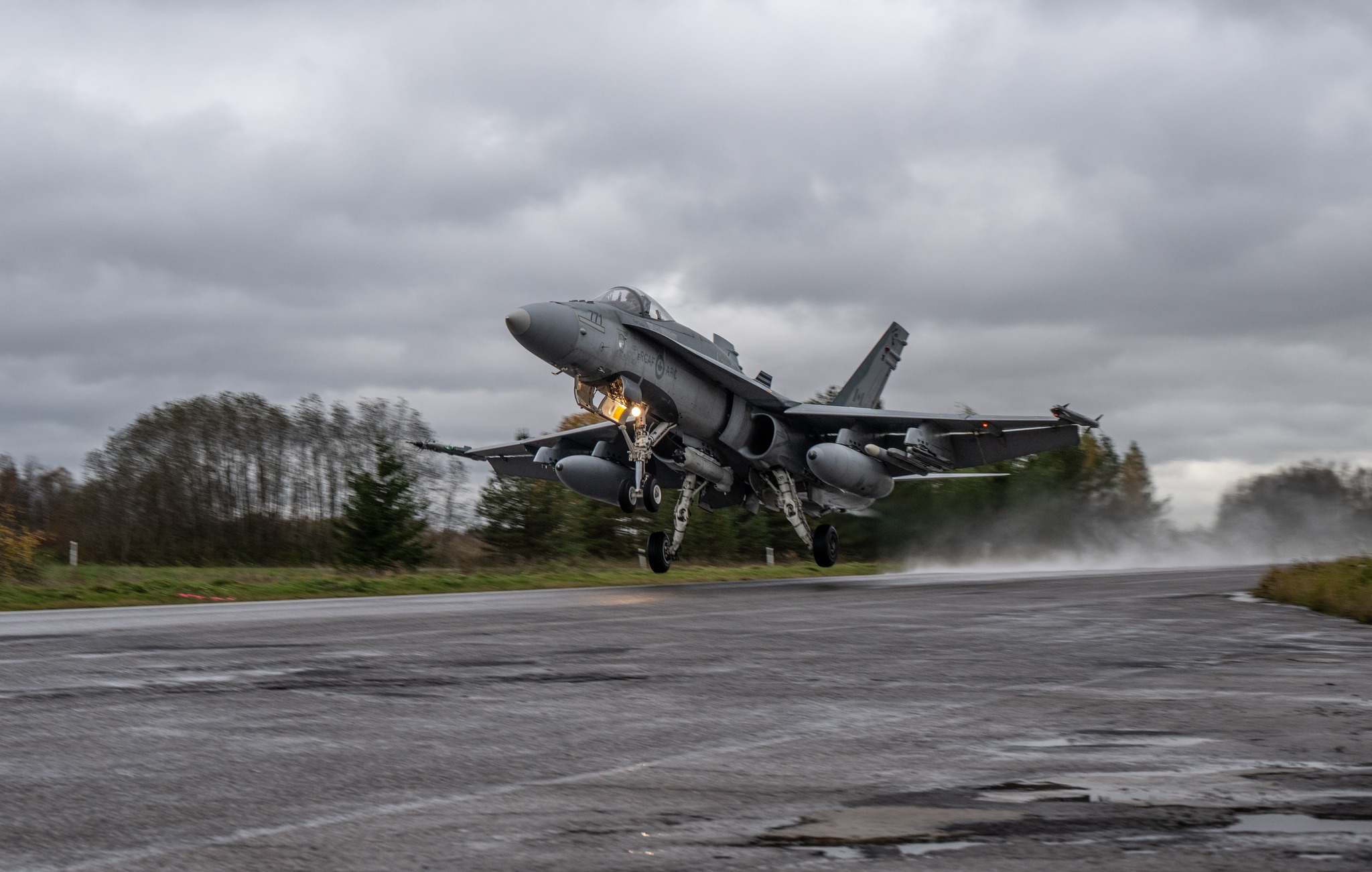 CF-188 Hornet fighter jet on the Jägala-Käravete highway, a portion of a longer road known as Piibe highway, Estonia—the first time ever that the RCAF has executed such a landing. This was an important milestone for our Air Force adoption of the principals of Agile Combat Employment (ACE) and Agile Operations Employment (AOE) on Air Task Force (ATF) Tarassis, deployed as part of Operation REASSURANCE, at Jägala-Käravete, Estonia, October 13, 2025.