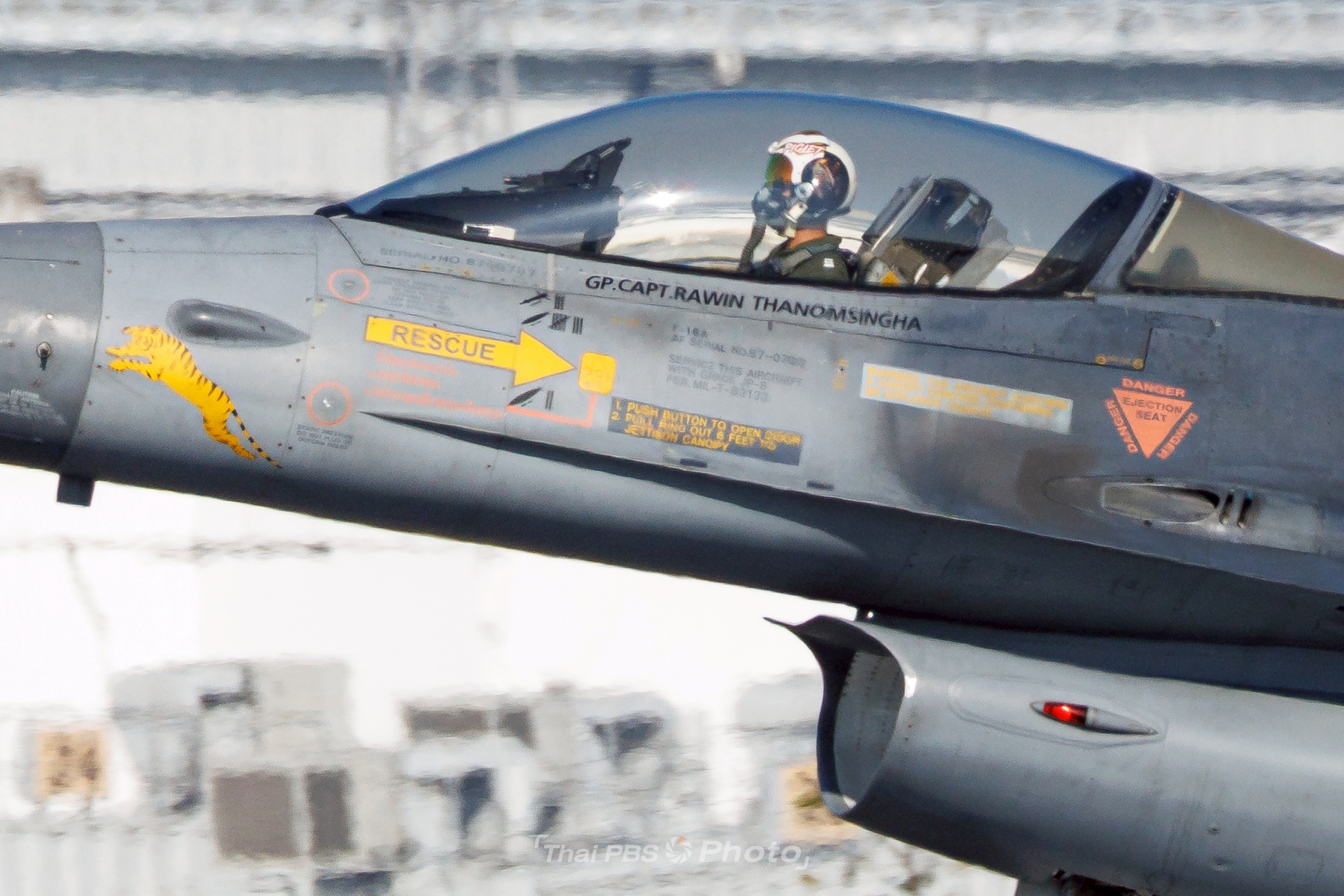 Incidentally, the fighter has the name “GP. CAPT Rawin Thanomsingha” emblazoned below the cockpit glass. It was flown extensively by now Air Vice Marshal Rawin “Hollywood” Thanomsingha when he was attached to Korat to fly the F-16 as a demonstration pilot. You may read our article on his new role as “air boss.”