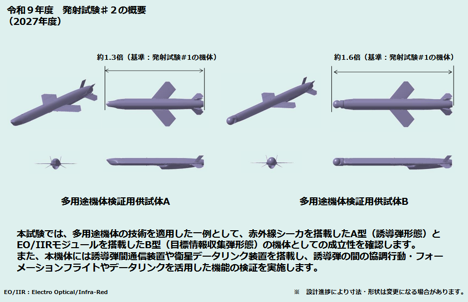 Specimen A, designated the guided missile type, carries an infrared seeker and represents a conventional strike weapon configuration. It proves the platform works as an anti-ship or land-attack missile. Specimen B, the target information collection type, takes a different approach. Instead of a warhead, it carries an EO/IIR sensor module and serves as what Japanese defense planners call a Target Observation Projectile.