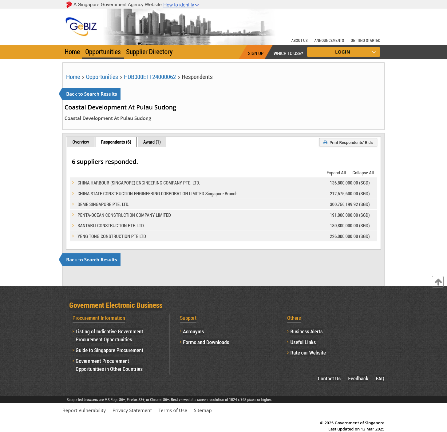 The Housing and Development Board launched the coastal development tender, designated HDB000ETT24000062, in March 2024. It closed on Jul. 17, 2024, with six companies submitting bids ranging from SGD 136.8 million to SGD 300.76 million. China Harbour (Singapore) Engineering Company Pte. Ltd. submitted the lowest bid at SGD 136.8 million, followed by Santarli Construction Pte. Ltd. at SGD 180.8 million and Penta-Ocean Construction Company Limited at SGD 191 million. China State Construction Engineering Corporation Limited Singapore Branch bid SGD 212.6 million, while a consortium of Dredging International Asia Pacific Pte Ltd and Woh Hup (Private) Limited submitted the highest bid at SGD 300.8 million. The winning bid went to Santarli Construction Pte. Ltd.