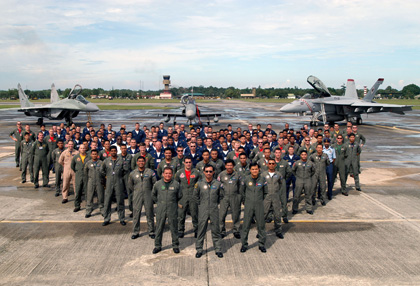 Crew and pilots from U.S. Navy Strike Fighter Squadrons (VFA) 102, 192 and 195 pose with counterparts from the Royal Malaysian Air Force's (RMAF) No. 6, 17 and 19 Squadrons in front of an RMAF MiG-29. left, an RMAF Hawk, center and an F/A-18F Super Hornet during an aircraft display and photo session that wrapped up a 10-day combined air exercise. U.S. Navy photo by Lt. Chuck Bell.