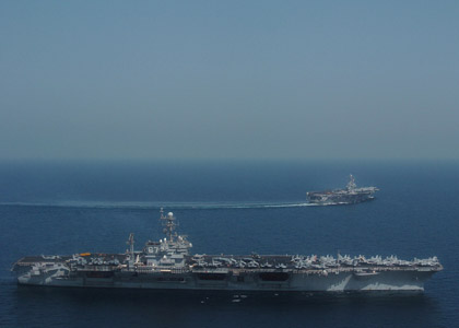 A changing of the guard occurred Nov. 20, when the USS Harry S. Truman (CVN 75) Carrier Strike Group relieved the USS John F. Kennedy (CV 67) Carrier Strike Group on station in the North Arabian Gulf Nov. 21. In the picture, the conventional aircraft carrier USS John F. Kennedy (CV 67), is relieved by the Nimitz-class aircraft carrier USS Harry S. Truman (CVN 75) shown making her turn away from Kennedy, and assuming duties under U.S. Navy Commander Fifth Fleet. U.S. Navy photo by Photographer's Mate Airman Ryan O'Connor