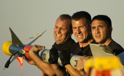 Loadeo is the weapons-loading competition taking place here during the 2004 William Tell air-to-air weapons meet. (From left) Senior Airman Mike Raimondo, Staff Sgt. Jacob Watson and Airman 1st Class Joseph Ragadio carry an AIM-9M missile to an F-15 Eagle during the static weapons load competition here Nov. 9. They are weapons loaders assigned to the 71st Fighter Squadron at Langley Air Force Base, U.S. Air Force photo by Tech. Sgt. Ben Bloker.
