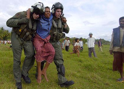 Two Naval Air crewmen, assigned to the �Golden Falcons� of Helicopter Anti-Submarine Squadron Two (HS-2), carry a seriously injured Indonesian woman to a waiting helicopter for transportation to a medical facility.