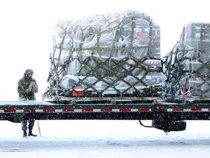 Senior Airman Daruis Justice braves blowing snow on the flightline while preparing pallets of communications equipment for shipment to areas affected by tsunamis. U.S. Air Force photo by Tech. Sgt. Mikal Canfield.