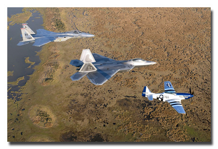 An F-15 Eagle, F/A-22 Raptor and P-51 Mustang train for heritage flight formation flying.