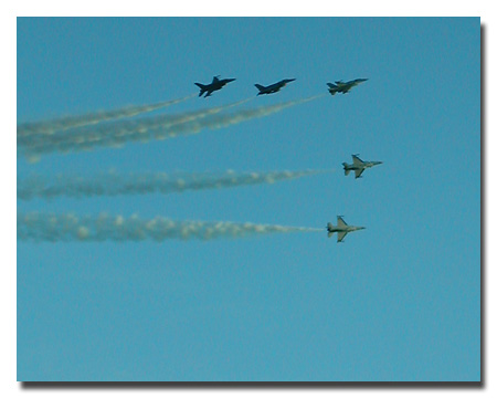 Yesterday was the 1st combined rehearsal for Singapore's 40th Birthday on Aug 9. I was able to get a good view of the aerial display from the 44th storey of a building. The photos are not very good as I am using an old camera. The big surprise was a M113 fitted with a new surface to air missile system for the RSAF. The system seems to be based on the Russian Igla missile and the layout looks like a mini Rapier system on top of a APC. Rumors of its existence surfaced 2 years ago when it was spotted by the public. This is the first time the RSAF is operating a SAM from a track vehicle. I'll try to get pictures of it this coming Saturday.