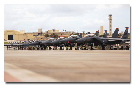 10 F-4EJ Kais and two E-2C Hawkeyes from JASDF joined 12 U.S. Air Force F-15E Strike Eagles for mock combat during the recent Cope North exercise in Guam. U.S. Air Force photo by Staff Sgt. Bennie J. Davis III.