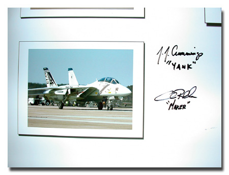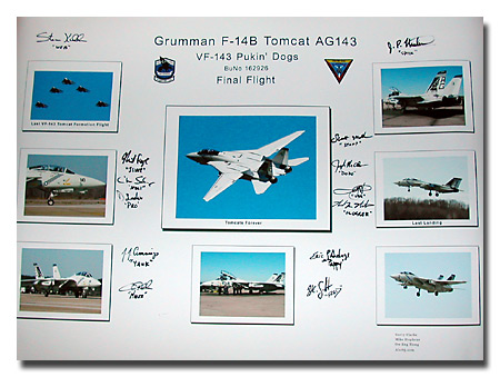 This poster was created as the result of a collaboration between 3 people living at different locations, communicating via email. Yesterday it came back to me after traveling across the pacific ocean, across the west coast to the east coast of United States to NAS Oceana. Thirteen pilots from VF-143 signed the posters for Mike and me with the help from Gerry. Both Mike and I would like to thank Gerry and the PAO of Pukin' Dogs for making it possible.