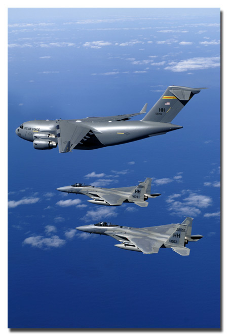 F-15 Eagles from the 199th Fighter Squadron, 154th Wing, Hawaii Air National Guard escort the first Hawaii-based C-17 to its home. U.S. Air Force photo by Tech. Sgt. Shane A. Cuomo.