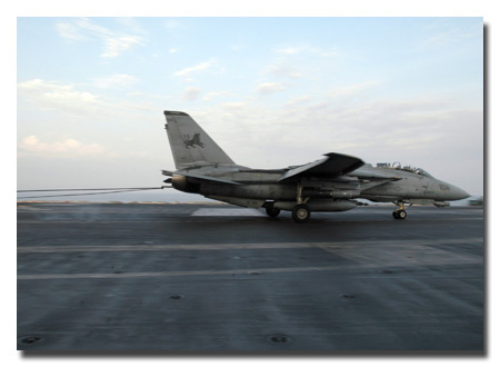 Blacklion's aircraft 204 is the last F-14 to be trap from a combat mission. CAG Capt. William G. Sizemore II made the trap on Feb. 8 at 12:35 a.m. U.S. Navy photo by Photographer's Mate 3rd Class Tony Foster.