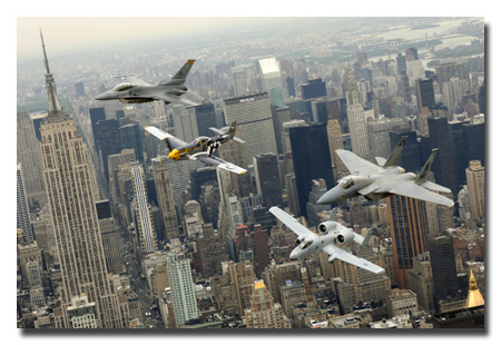 A beautiful sight! A P-51 Mustang, an F-16, an F-15 and an A-10 fly over New York City on Thursday, May 25, 2006. U.S. Air Force photo/Tech. Sgt. Ben Bloker.