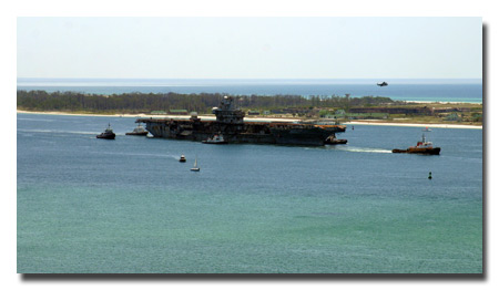 USS Oriskany passing in front of Pensacola's historic Fort Pickens while on its way to be sunk in the Gulf of Mexico today. U.S. Navy Photo by Mike O'Connor.