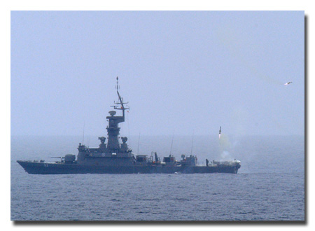 The Republic of Singapore Navy missile corvette RSS Vengeance launches two BARAK missiles and shot down two BQM-74E aerial drones launched from the deck of USS Tortuga yesterday.