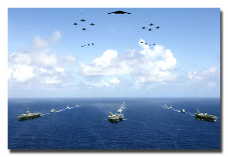 A B-2 leading 16 other aircraft from the U.S. Air Force, Navy and Marine Corps fly over the USS Kitty Hawk, USS Ronald Reagan and USS Abraham Lincoln carrier strike groups to kick-off Exercise Valiant Shield 2006. U.S. Navy photo/Chief Photographer's Mate Todd P. Cichonowicz.