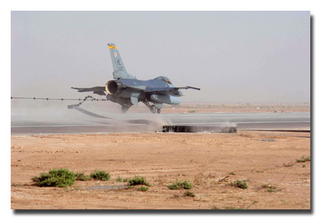 An F-16 Fighting Falcon tests the new aircraft arresting barrier at the end of the runway at Balad Air Base, Iraq, Jul. 4. U.S. Air Force photo/Staff Sgt. Tony Tolley.