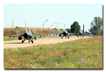 Three F-16 Fighting Falcons taxi for takeoff before the last sortie flown at Mihail Kogalniceanu Air Base, Romania, during Exercise Viper Lance 2006. We got a video as well. U.S. Air Force photo/Senior Airman Eydie Sakura.