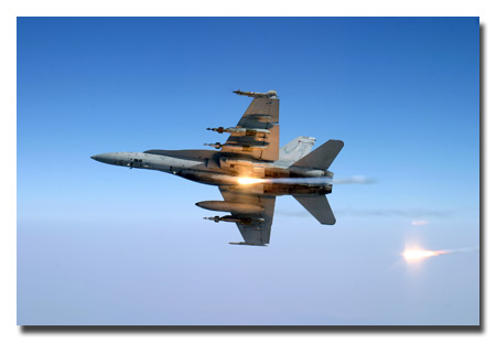 A F/A-18C assigned to VFA-136 tests its flare countermeasure system before heading into Afghanistan on a Close Air Support mission. U.S. Navy by Lt. Peter Scheu.