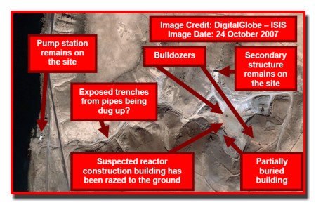 New satellite images analyzed by the Institute for Science and International Security showed that the Syrians have build a new building over the site bombed by Israel in September. New images also show trenches and pipes leading east away from the site to a possible water treatment facility.