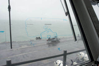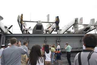 The ride up the elevator gave the US Navy a chance to showcase how quickly it can generate naval aviation. Four deck edge lifts ring the carrier's 4.5 acre flightdeck. Though we braced ourselves for the ride up, almost all of us experienced buckled knees as the elevator shot up and emerged flush with the flight deck.