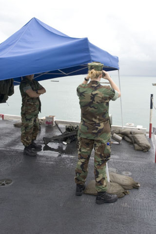 Small arms enthusiasts also eye-balled Marines and sailors on duty who were armed with an assortment of small arms like M-16s and M-60 GPMGs as the last ditch defence against seaborne intruders.