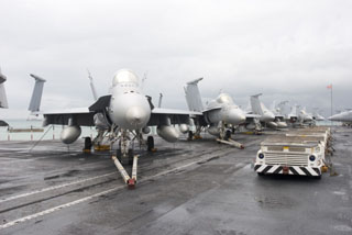 The flight deck was a veritable Hornet's nest - crammed with the latest F/A-18E/F Super Hornets, a clutch of C-2 Greyhound carrier onboard delivery planes, E-2C Hawkeye Airborne Early Warning aircraft and Seahawks.